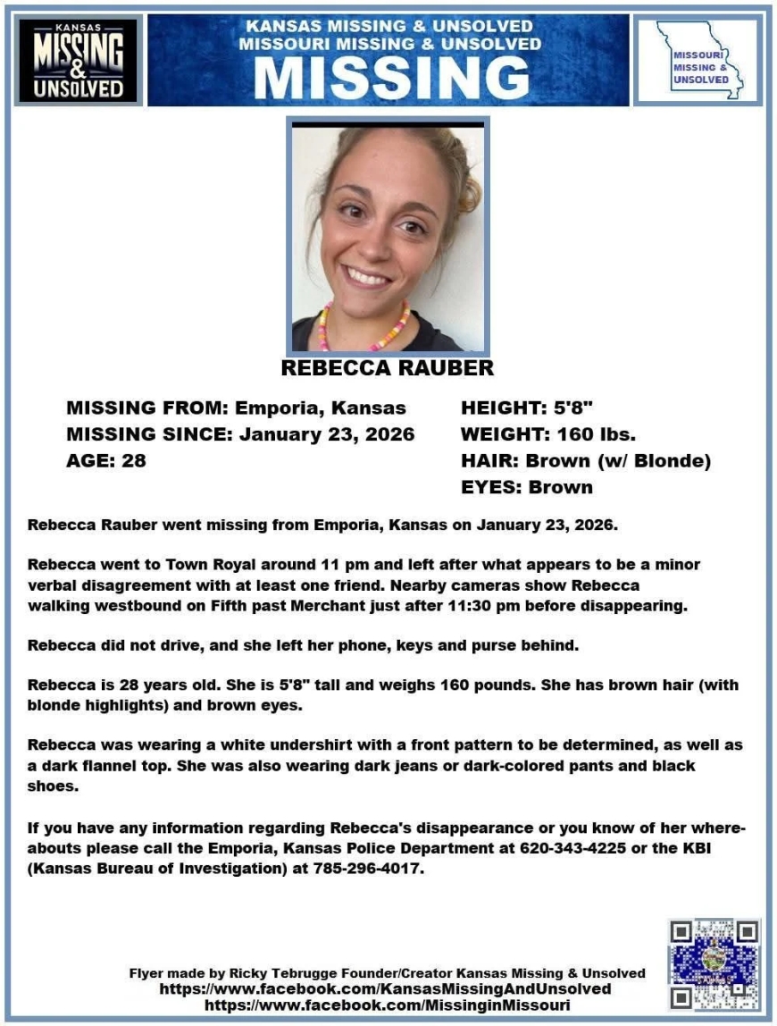 Rauber, a second-grade teacher at Riverside Elementary School in Emporia, was reported missing early Saturday after leaving a downtown bar late Friday night without her jacket, phone or purse as temperatures plunged into the single digits. Surveillance footage captured her walking alone shortly before midnight amid rapidly worsening conditions from Winter Storm Fern.