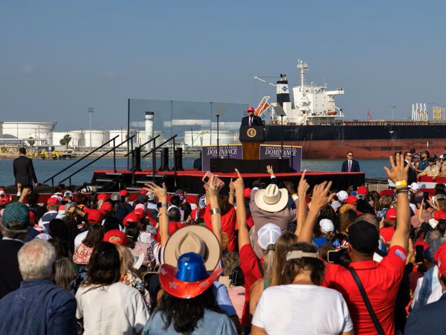 Appearing at the Port of Corpus Christi in Texas, President Trump took to the stage wearing a red “Gulf of America” hat as his campaign song God Bless the USA played.