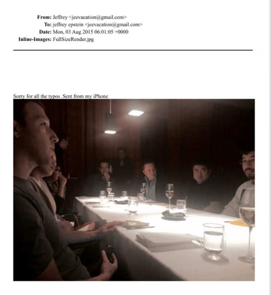 The image was emailed by Epstein to himself on August 3, 2015, one day after he bragged in private messages about attending what he described as a “wild” dinner with several high-profile technology executives in California.