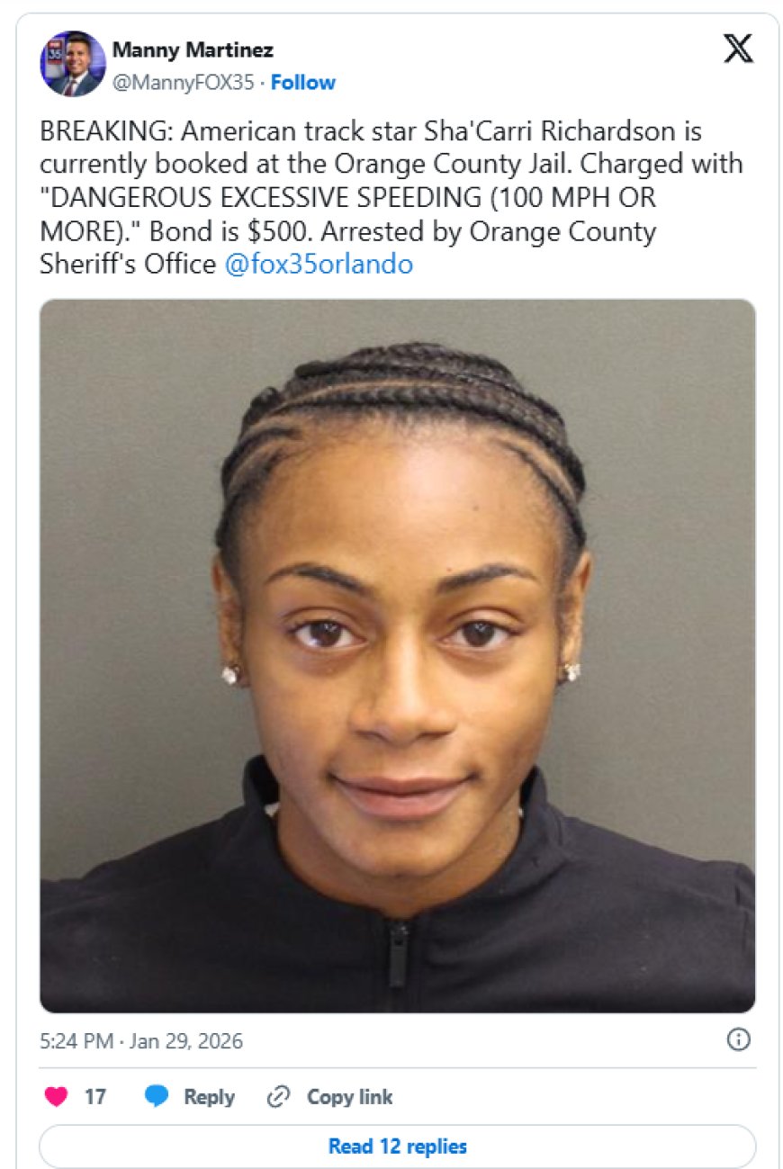 The electrifying track star, fresh off her Olympic gold medal triumph, was arrested early Sunday morning in Orlando after allegedly clocking 104 miles per hour in a 65-mph zone, according to local reports. Authorities say Richardson was pulled over shortly after 4 a.m., when officers observed her vehicle speeding along a Florida roadway.